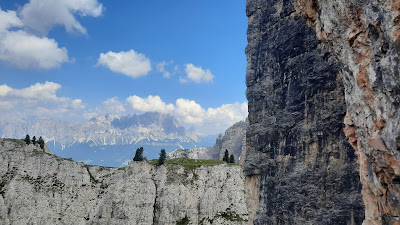 L'extensa muralla del Lastoni di Formin és un focus que centra la nostra atenció. A l'oest, gegantesques agulles fragmenten la seva continuïtat, bastions isolats que brinden noves oportunitats de verticalitat. Entre elles la Torre Marcella destaca per fermesa. El bosc l'empara.